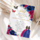 This chic Quinceañera invitation for twins features a gold glitter geometric frame adorned by vibrant royal blue and fuchsia pink floral and two girls in a fuchsia dress and in a royal blue dress. Personalise it with your details easily and quickly, simply click the "Edit Using Design Tools" button to modify the text, wording, font style, font size, and font colour. You can also add or remove text, and move or remove images. The butterflies, quince girls and crown are moveable, resizable, duplicatable, and removable, allowing you to customise the design to suit your occasion.