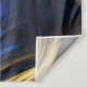 This pattern features a breathtaking fusion of royal blue and gold, masterfully intertwined to form an abstract swirl pattern that captivates the eye. This dynamic composition exudes an organic quality, reminiscent of natural landscapes, where the flowing lines and curves suggest the gentle undulations of hills and valleys. The interplay of colours is further enhanced by the inclusion of beautiful, iridescent metallic tones that shimmer and shift with the light, creating a mesmerising visual experience. This image is AI generated.
