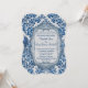 Monogrammed retro royal blue leafy damask pattern on a silver background with printed ribbon Wedding Invitation.