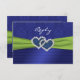 This royal blue and lime green damask FAUX pleated RSVP card has a PRINTED ON ribbon with a FAUX glitter and diamond joined jewelled hearts on it that matches the wedding invitation shown below. All the text is customisable and so are the paper choices. If you require any other items in this same design, please email your request to niteowlstudio@gmail.com.