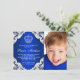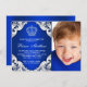Prince birthday party invitation with diamond crown on a royal blue and white swirl background. This royal blue prince birthday party invitation is easily customised for your event by simply adding your photo and event details in the font style and colour, and wording of your choice. This is a printed design with no real diamonds, glitter, etc.