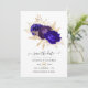 Royal blue and purple floral wedding save the date card with accents of gold customisable to your event specifics.