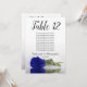 These beautiful table number cards will make it easy for your guests to find their seats at your wedding reception. They feature a simple yet elegant design with script calligraphy lettering and a single long-stemmed vivid royal blue or cobalt coloured rose lying on its side reflecting in water. The card includes a seating chart with 10 names. There is also space for the couple's names and wedding date. This card is available in a variety of sizes and is larger than our standard table number cards.