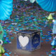 chic gradient blue background with rose decoration and happy christmas with hearts and grains at the top to give the touch of snow and very little purine at the bottom.