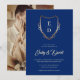 This design features traditional classic romantic royal blue and rustic golden coloured background, elegant monogram and calligraphy script personalised photo save the date invitation. This product can be easily personalised. If you need help with the customisation of the product or need matching products kindly please contact me via Zazzle.