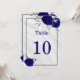 royal blue flowers with some silver grey leaves silver faux foil geometric table number card
