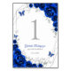 Royal blue silver and white Quinceanera celebration table number cards. Features, script font, silver butterflies, watercolor roses and tiara. Perfect for an elegant princess style glam celebration. Personalize with your own details. Printed Zazzle invitations or instant download digital printable template.