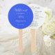 Wedding day program printed on a round style hand fan that features a trendy, royal blue colour background on the front side with the bride and groom names in white, stylised script. Back side of program lists the wedding party participants and ceremony rites on a white background with dark grey lettering. Edit hand fan and replace wedding program info with your own. Perfect for an indoor or outdoor wedding ceremony! Select number of hand fan programs desired.