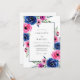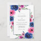 This design features a lush arrangement of watercolor roses and anemones in bold shades of royal blue and vibrant magenta. Delicate green foliage accents the blooms, creating a romantic and sophisticated botanical aesthetic. The rich colour palette is perfect for a vibrant spring or summer ceremony. Painterly details add an artistic touch to the floral art.
