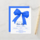 A white background, decorated with a large royal blue bow. Personalise and add a name and party details.