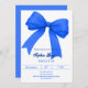 A white background, decorated with a large royal blue bow. Personalise and add a name and party details.