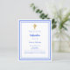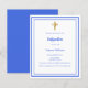 A white background, decorated with a royal blue frame, and a golden cross Personalise and add the name and details. Royal blue text.