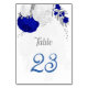 Romantic royal blue & white flowers with silver leaves botanical wedding table number card.