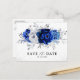 Elegant royal blue white silver theme wedding save the date postcard featuring elegant bouquet of royal blue, Navy, silver, pure white colour rose flowers buds and sage green eucalyptus leaves. Please contact me for any help in customisation or if you need any other product with this design.