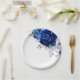 Elegant royal blue white silver theme wedding paper plate featuring elegant bouquet of royal blue, Navy, silver, pure white colour rose flowers buds and sage green eucalyptus leaves. Please contact me for any help in customisation or if you need any other product with this design.