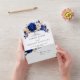Elegant royal blue gold theme wedding Invitation featuring elegant bouquet of royal blue, Navy, gold, yellow colour rose flowers buds and eucalyptus leaves. Please contact me for any help in customisation or if you need any other product with this design.
