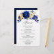 Elegant royal blue gold theme wedding menu featuring elegant bouquet of royal blue, Navy, gold, yellow colour rose flowers buds and eucalyptus leaves. Please contact me for any help in customisation or if you need any other product with this design.