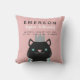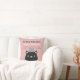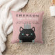 A pink birth stats throw pillow for the nursery featuring a royal cat wearing a silver crown and royal mantle trimmed with fur. Add your child's name and birth stats in black and white fonts. The back features a chic check pattern in matching colours.