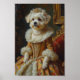 An elegant royal portrait featuring the Coton de Tulear portrayed as a graceful island princess. Inspired by classical European oil paintings, the design highlights the breed’s soft fluffy coat with luxurious royal attire and a delicate jewelled tiara.
