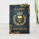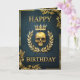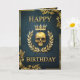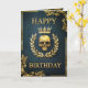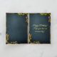 A dark & luxurious Cyan leather birthday card adorned with royal gothic gold relief featuring a menacing golden skull flanked by a laurel wreath of golden leaves and finally a glorious golden crown Shining with dazzling light symbolizing an ancient royal linage.