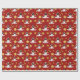 Christmas wrapping paper with an illustration of cute little royal penguin holding a sceptre and wearing a red Santa hat; Christmas holiday cartoon design for kids, on red background with customisable text template for your name or message; illustrated by Radka Kavalcova