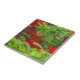 The beautiful vermilion flowers in the original photograph by MaeFlowers on this small Ceramic Tile are blooming on a royal poinciana. This lovely tree is sometimes called a Flame Tree. Its yellow-green leaves are airy and fern-like. The band of China red flowers crosses diagonally through the leaves, which look a bit like feathers. The photo has a canvas texture, giving it the look of tapestry. but in a modern orange-red, yellow-green colour scheme.