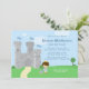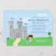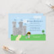 This cute 5x7 boy's birthday party invitation has a Royal Prince Charming theme! There is a grey castle in the background with three blue flags flying at the top. At the bottom, there is a brown haired Prince wearing a gold crown with a blue jacket. On the ground next to the prince, there is a red rose and a shield. On the right side, you can easily customise the birthday party information. Graphics by Zenware Designs at MyGrafico.com