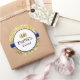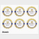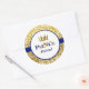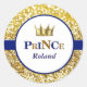 Royal prince stickers in blue and gold have a gold crown on top and say "PRINCE (your name)" on them. The background of these stickers are glittery gold. They have a navy blue trim on them.