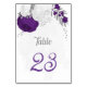 Romantic royal purple & white flowers with silver leaves botanical wedding table number card.