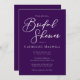 This royal purple bridal shower invitation features beautiful white typography on a solid deep violet card for an evening party in the winter. Minimalist script and a bold colour makes your bridal event invite pop and stand out from the crowd.