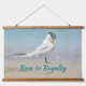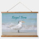 A set of 3 real wood topped hanging tapestries each with a different photographic Royal Tern posing on a sandy beach with beautiful tropical blue sea water background. Each wall art is individually customisable for your own text or Names.