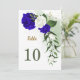 beautiful royal blue and white flowers with some green leaves and gold glitter table number card
