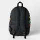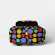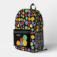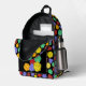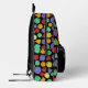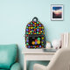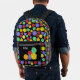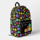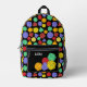 It's the perfect backpack for game night. This backpack has illustrations of role-playing game style dice with 12-sided, 20-sided and 4-sided dice in bright colours against a black background. The front pocket has a spot to add your initials or name.