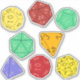 This sheet contains 8 different die cut style stickers depicting different fantasy game or role-playing game dice in yellow, red, green, orange, and purple with illustrations of 12-sided, 20-sided and 4-sided dice.