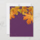 Matching RSVP Response card to return to the bride for an accurate guest count. Includes free white envelopes. A deep rich eggplant purple background sets off this brilliantly coloured fall leaf wedding design was created from artwork that was hand painted by Audrey Jeanne Roberts and then graphically designed into this simple, modern, clean lined wedding invitation set with matching products for showers, receptions and formal events. 5 autumn leaves that are turning colours from bright red to orange, gold and avocado green tumble from the trees and are layered over an art deco style simple gold leaf border, worn aged distressed vintage style parchment paper that is tea stained and confetti like faux gold glitter, sparkle splatters for a finishing touch. On the reverse side are the leaves and twinkling, glittering polka dots.