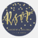 NewParkLane - Elegant wedding or engagement stickers, with 'RSVP' quote in elegant faux gold brush script typography, against a navy blue background with gold confetti. Easy to customise in Zazzle with your own names, date or other text for a personalised design. All text style, colours, sizes can be modified to fit your needs. You can also change the background colour to any colour you prefer.