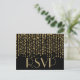 A pretty looking gold RSVP note card with strings of golden confetti on a black background. Design by Amelia Carrie for zazzle.com/GlitterInvitations Have a WONDERFUL event!!! Note: This is a graphic print of artwork and contains no messy glitter.