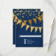 RSVP response return card with envelope. Sleek. Modern. Chic. Understated glam - with glittering pennant banners in two shades of golden glitter with sparkling twinkling falling confetti in various sizes and shade of gold. Sparkly starburst shining stars highlight the sparkle. A very contemporary typography text layout that is anything but traditional. It is simple and short. It says to your guests, "We're throwing a party and it will be the party of a lifetime!" For the elegant but non-traditional bride and groom. COLORS: deep dark royal navy sapphire cobalt blue and gold, golden glitters. Especially suited for fall or winter weddings, New Year's Eve Parties, Birthday parties and Anniversary party announcements.