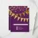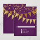 RSVP response return card with envelope. Sleek. Modern. Chic. Understated glam - with glittering pennant banners in two shades of golden glitter with sparkling twinkling falling confetti in various sizes and shade of gold. Sparkly starburst shining stars highlight the sparkle. A very contemporary typography text layout that is anything but traditional. It is simple and short. It says to your guests, "We're throwing a party and it will be the party of a lifetime!" For the elegant but non-traditional bride and groom. COLORS: deep dark violet eggplant purple and gold, golden glitters. Especially suited for fall or winter weddings, New Year's Eve Parties, Birthday parties and Anniversary party announcements.