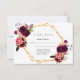 An elegant RSVP card for a wedding with templates for reply by date, names etc. Watercolored feathers and roses, flowers in burgundy. A faux gold and white frame. A white background on front, black text.