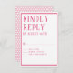 This RSVP Response card coordinates with the wedding invitation suite and is for your guests to fill out and return. Easily customise your information in our simple template. You can custom colour the border, font and background colour pattern using the simple tools provided. Shown in bright, rich pink. Modern, simple styling with a serif, all cap font design.