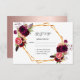 An elegant RSVP card for a wedding with templates for reply by date, names etc. Watercolored feathers and roses, flowers in burgundy. A faux gold and white frame. A white background on front, black text.