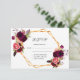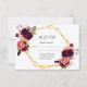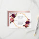 An elegant RSVP card for a wedding with templates for reply by date, names etc. Watercolored feathers and roses, flowers in burgundy. A faux gold and white frame. A white background on front, black text.