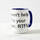 White 15oz mug with blue handle and rim. Has the text "No, I won't help you fix your computer. RTFM!" This comes from being a very frustrated Web Master involuntarily designated IT support.