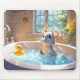 Cute grey mouse in a bathtub with soap bubbles and yellow rubber duck.