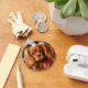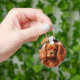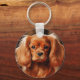 A close-up portrait of a Ruby Cavalier King Charles Spaniel. The dog is sitting on a soft, orange fabric with its paws neatly placed in front of it. Its large, dark eyes gaze directly at the viewer, conveying a sense of warmth and affection. The dog's fur is meticulously detailed, showcasing its soft texture and flowing waves. Perfect gift for Cavalier lovers.