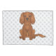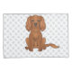 Destei's original cartoon illustration of a cute ruby colour Cavalier King Charles Spaniel breed dog who is sitting. The background has a pattern of grey dog paw prints.
