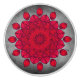 A translucent blood ruby-esque rosette, set over a mined rock textured canvas. Behind the rosette, a crack in the rock allows a tiny ray of sunlight to spill in...enhancing the design's translucence. Like the most valuable of rubies, fine silk inclusions are distributed lightly throughout this rosette, adding multi-faceted layers.