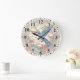 "hummingbird bird clock", "blue humming bird", "red flowers floral wall clock", "stained glass style art", "stain glass flowery nature", "beautiful animals in flight", "pretty flying spread wings",