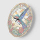 "hummingbird bird clock", "blue humming bird", "red flowers floral wall clock", "stained glass style art", "stain glass flowery nature", "beautiful animals in flight", "pretty flying spread wings",